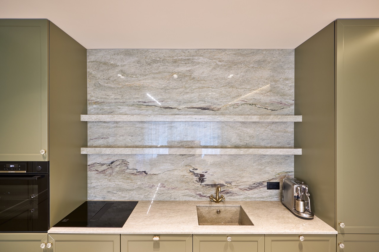 Kuarcit i bardhë elegant dhe transparent, i karakterizuar nga një sfond jashtëzakonisht të bardhë me vena të holla bezhë dhe hiri.